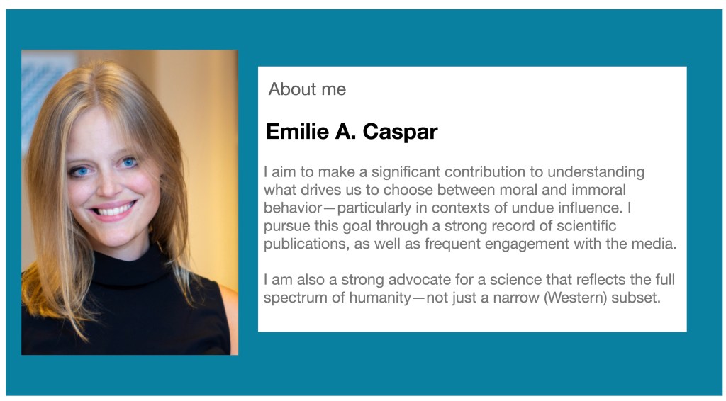 As I developed a novel methodological approach to address a critical yet unanswered question since the seminal work of Stanley Milgram, I have received many awards (e.g., Prize of Psychology, Evens Science Prize; Early Career Award in Social Neuroscience from the Society for Social Neuroscience – S4SN) and extensive worldwide media coverage (e.g., New York Times, Boston Globe, El País, BBC Reel, BBC Future, Netflix), which also includes dozens of podcasts and other scientific outreach events. My work has also been highlighted at prestigious events, including a Breakthrough Scientific Talk at the Falling Walls Foundation (https://www.youtube.com/watch?v=v9S9PlfZ99A&t=4s ) and the Nobel Prize Dialogue (https://www.youtube.com/watch?v=ImLvr9q24QQ&t=819s).